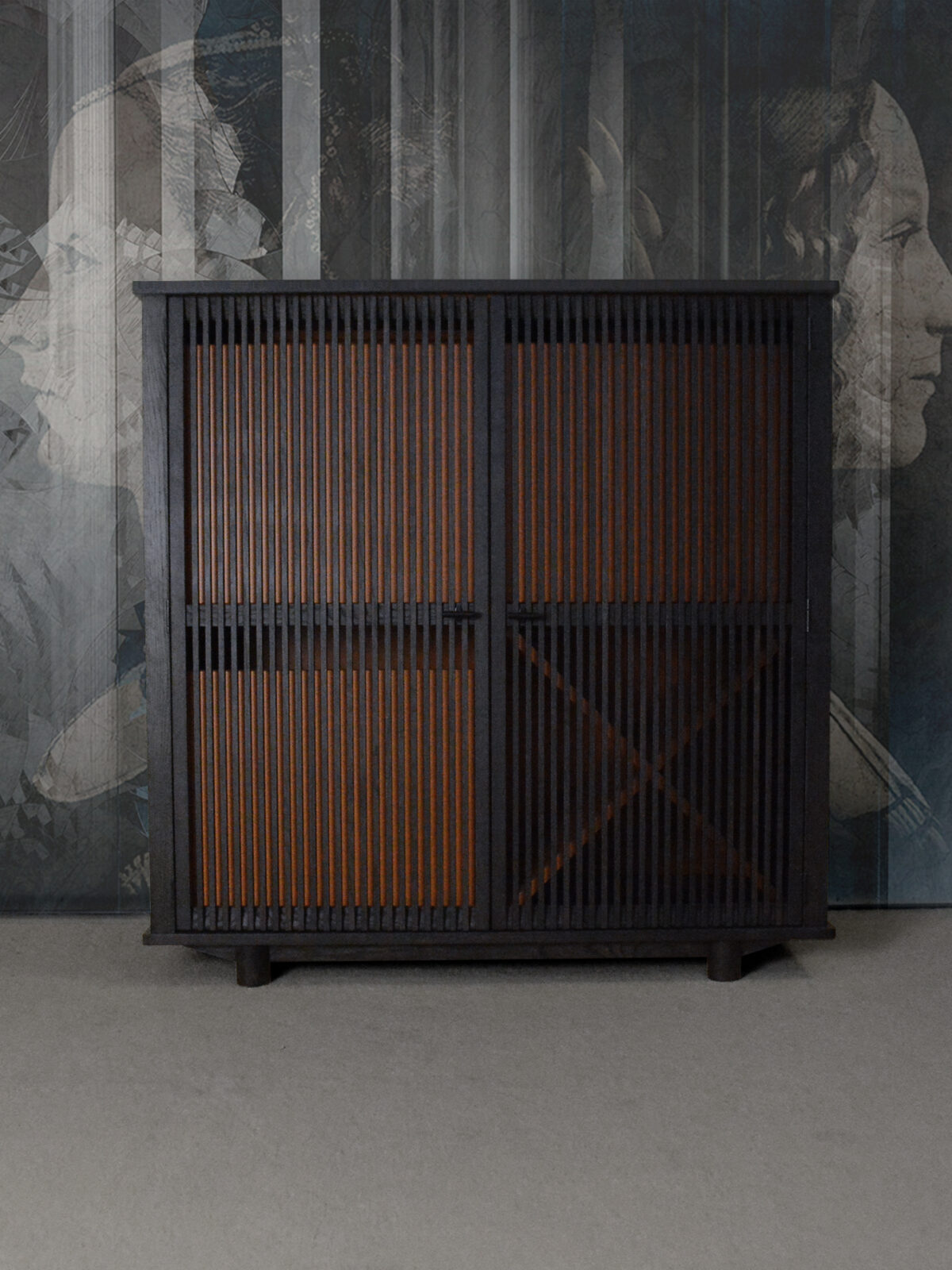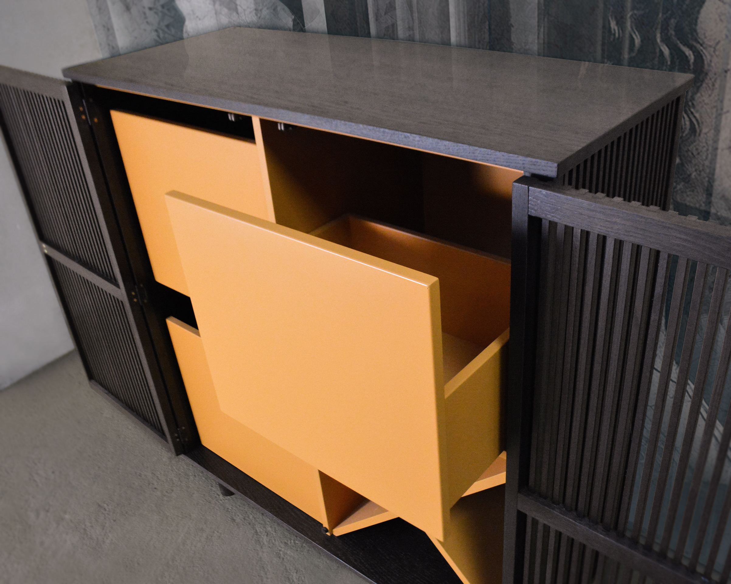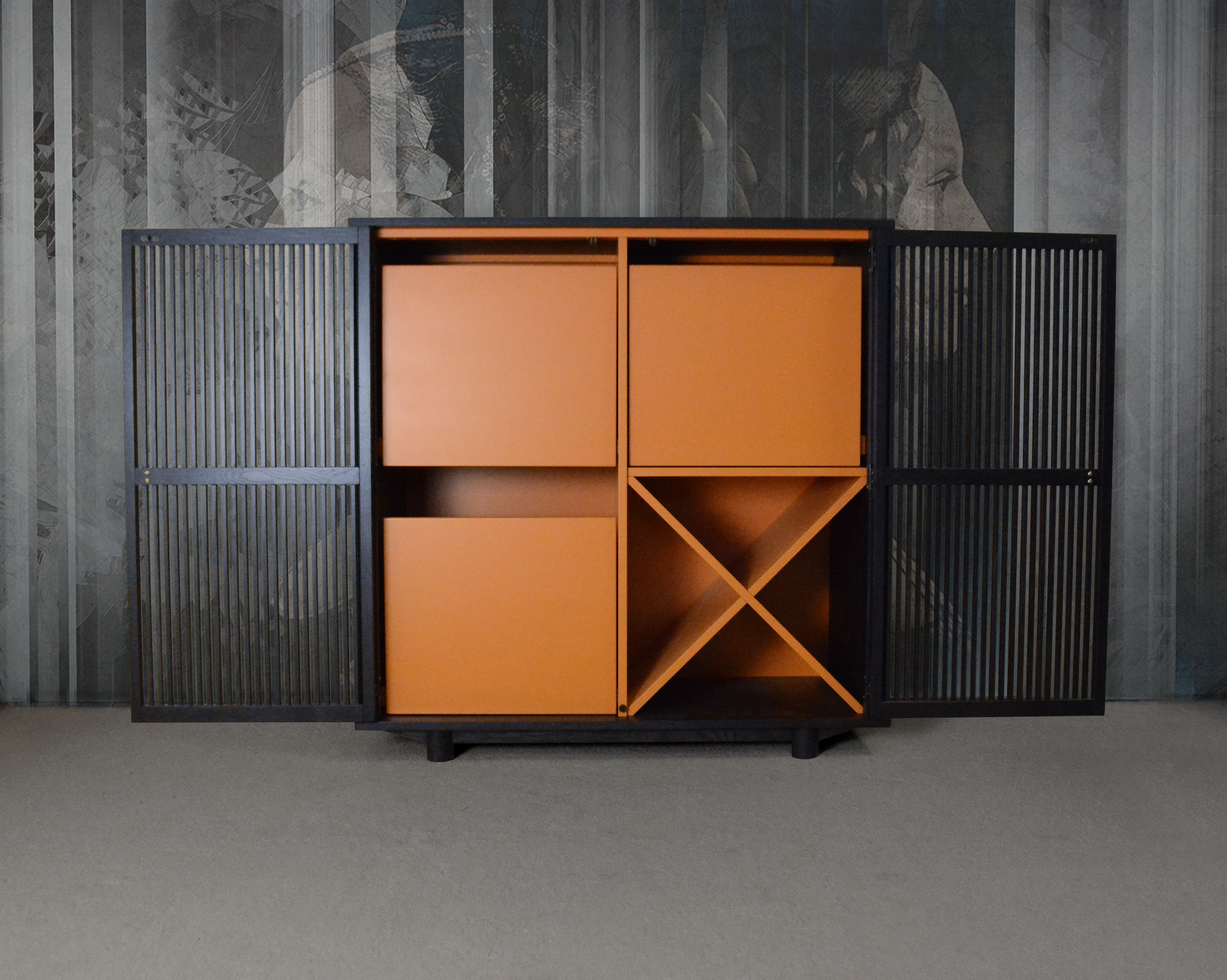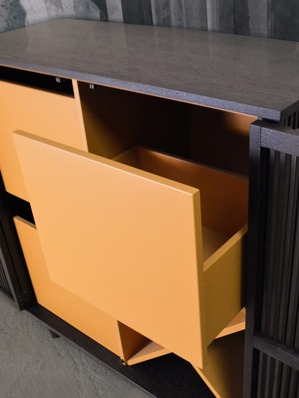 Рейки создают интересный ритм и тени, яркий цвет внутри – вносят живость в строгую форму изделия.