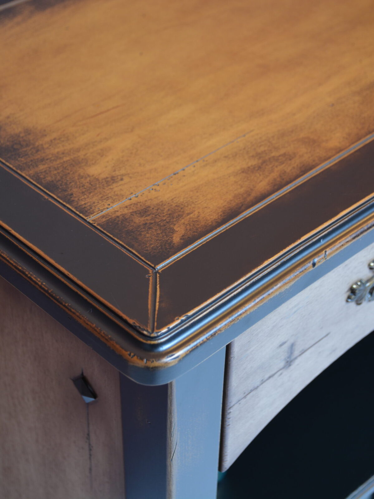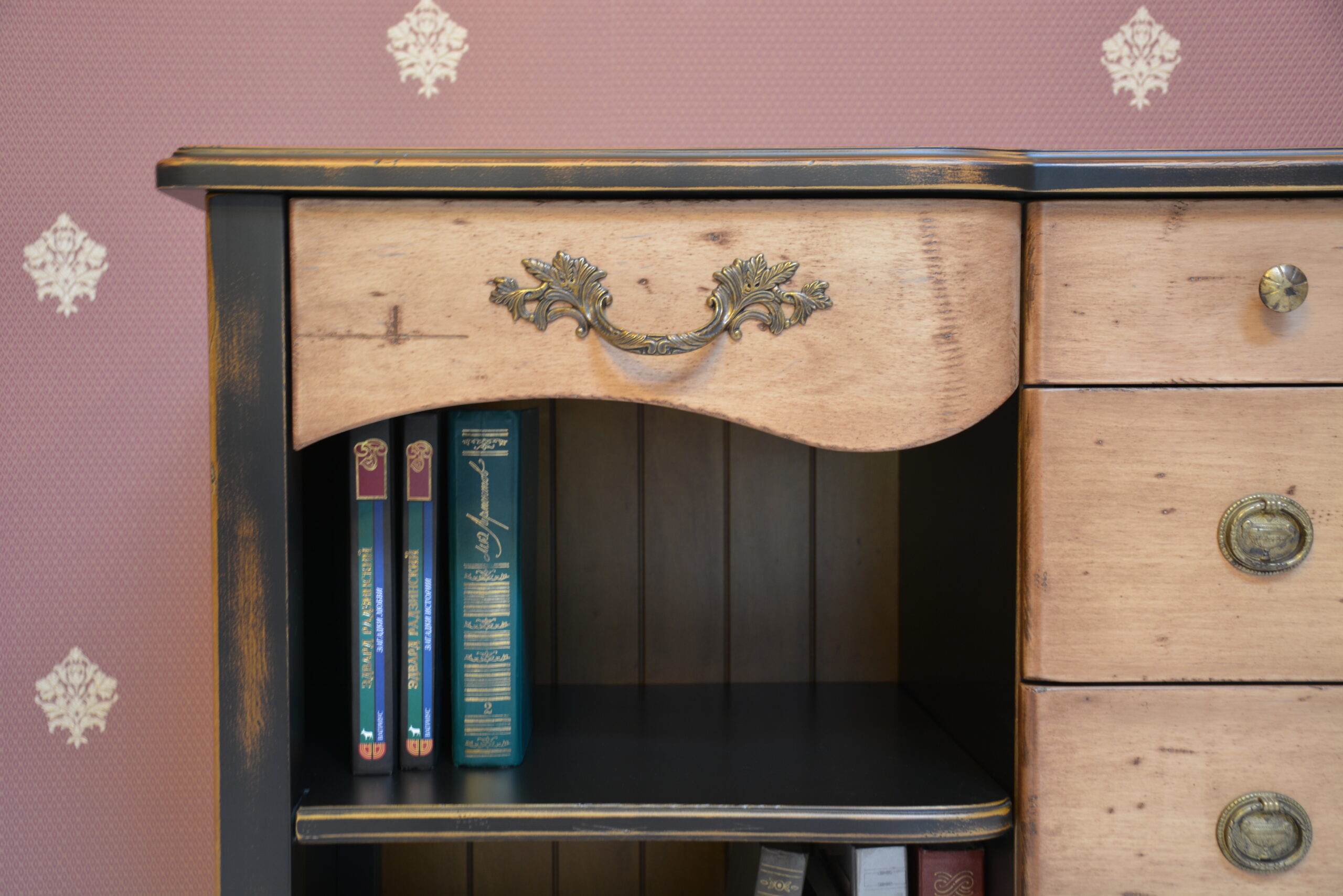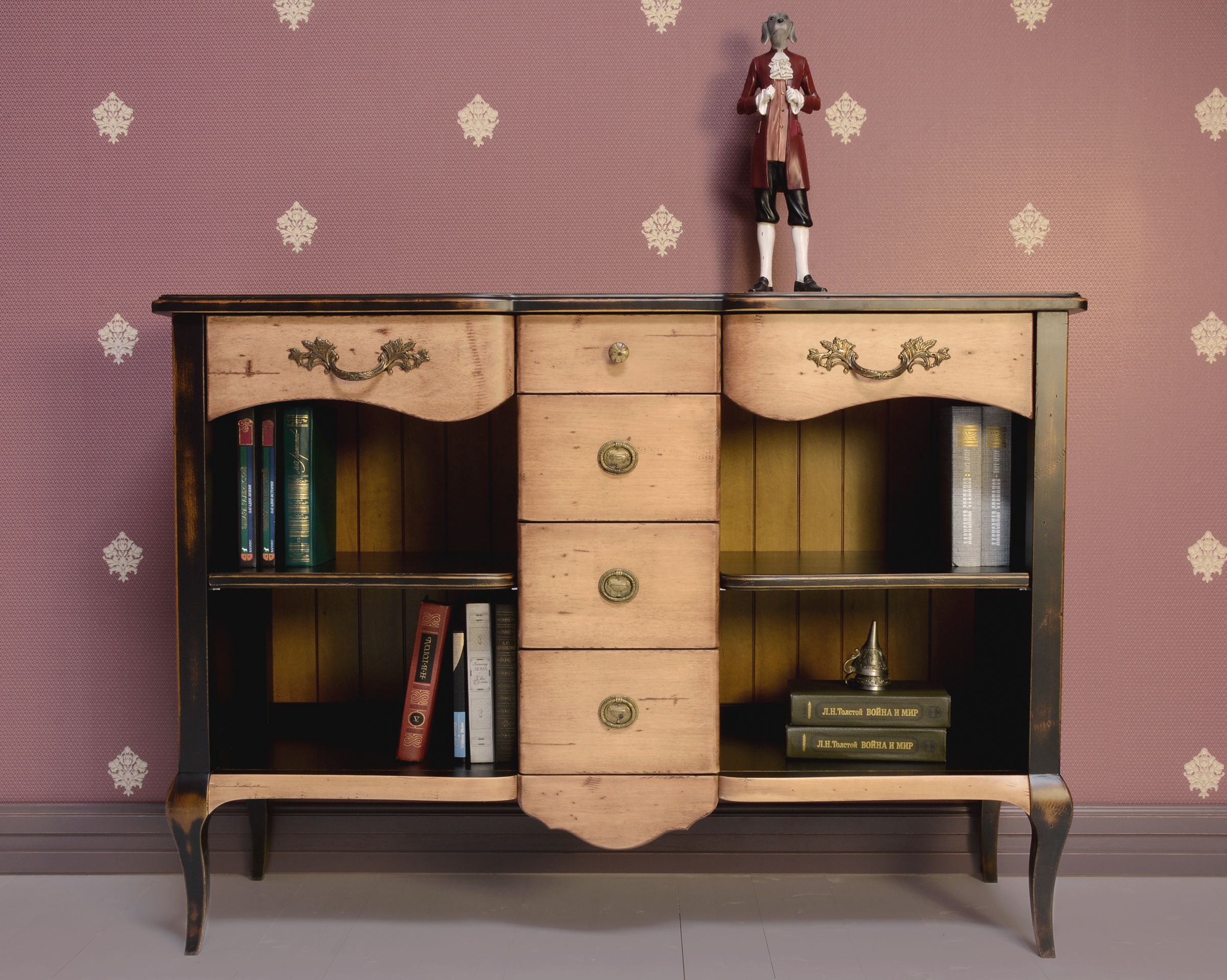Вариант для гостиной – комод с ящичками и открытыми полками с контрастной покраской и старением.