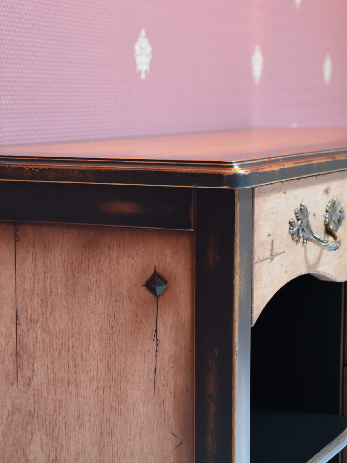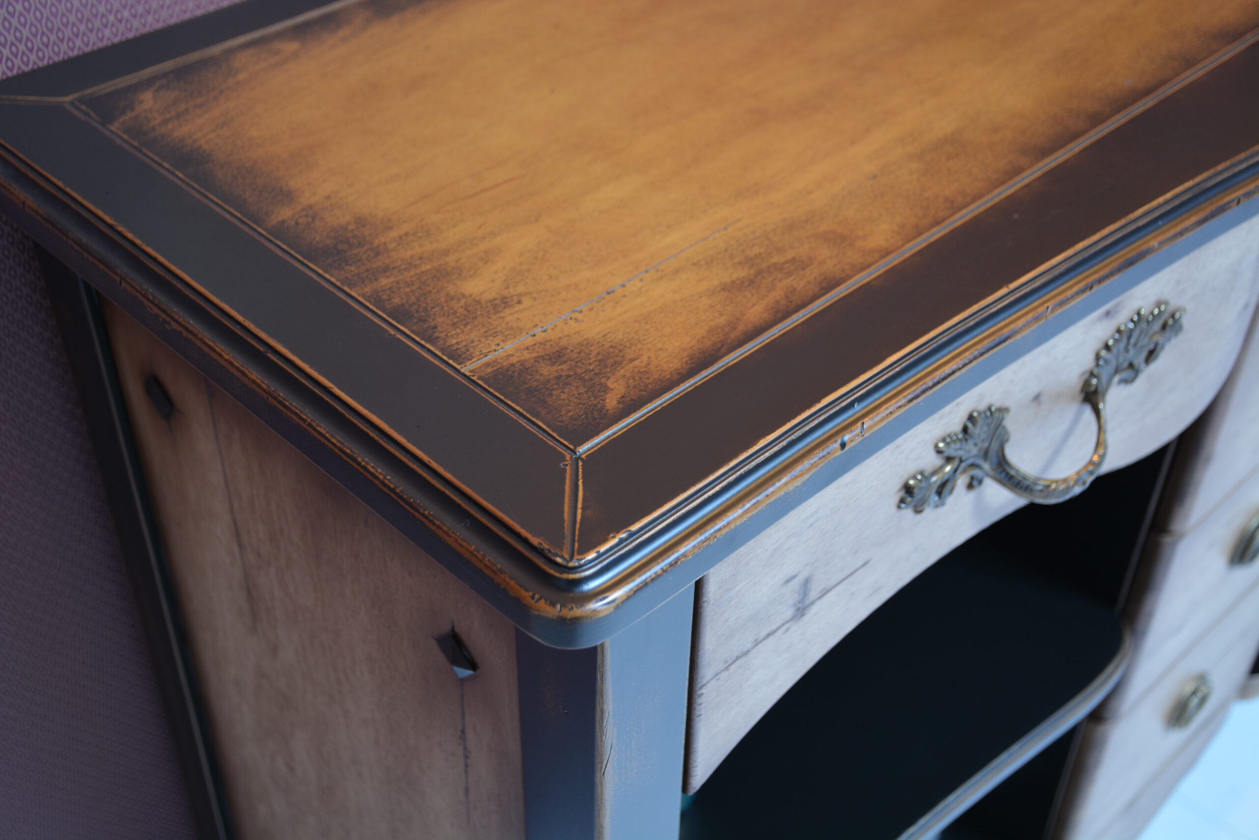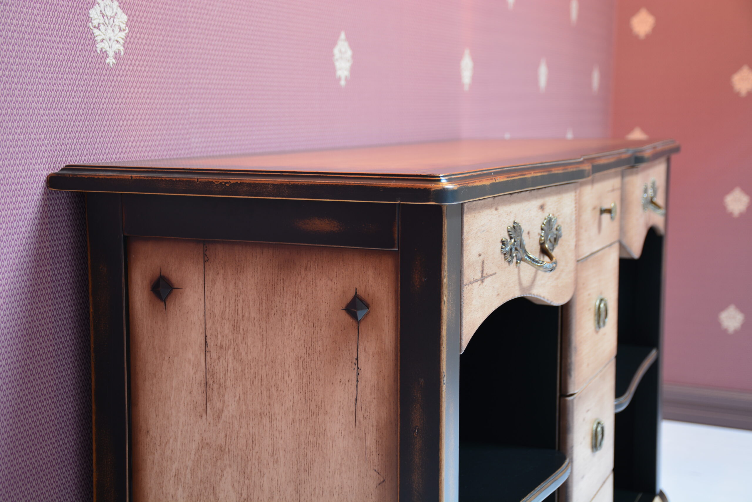 Вариант для гостиной – комод с ящичками и открытыми полками с контрастной покраской и старением.
