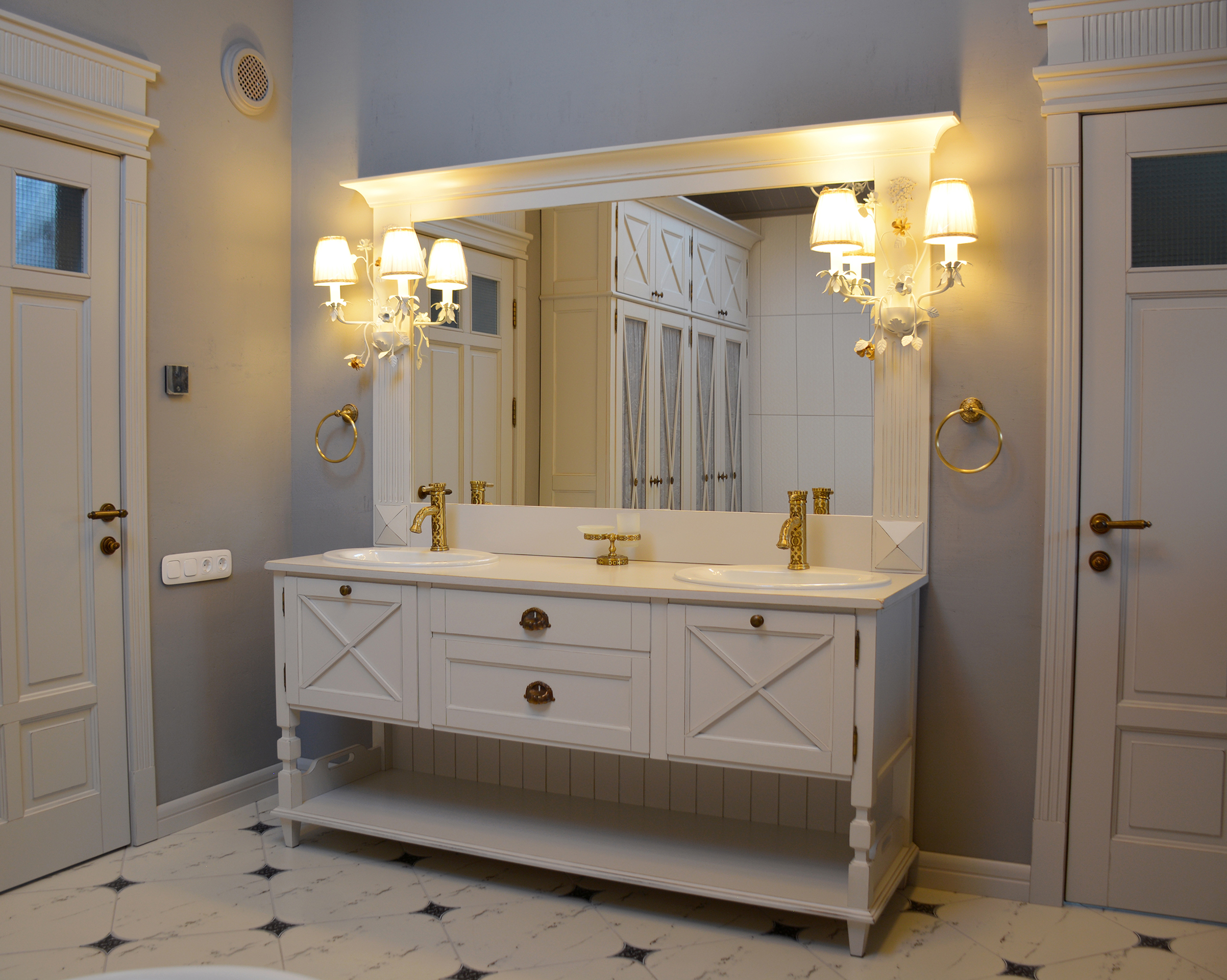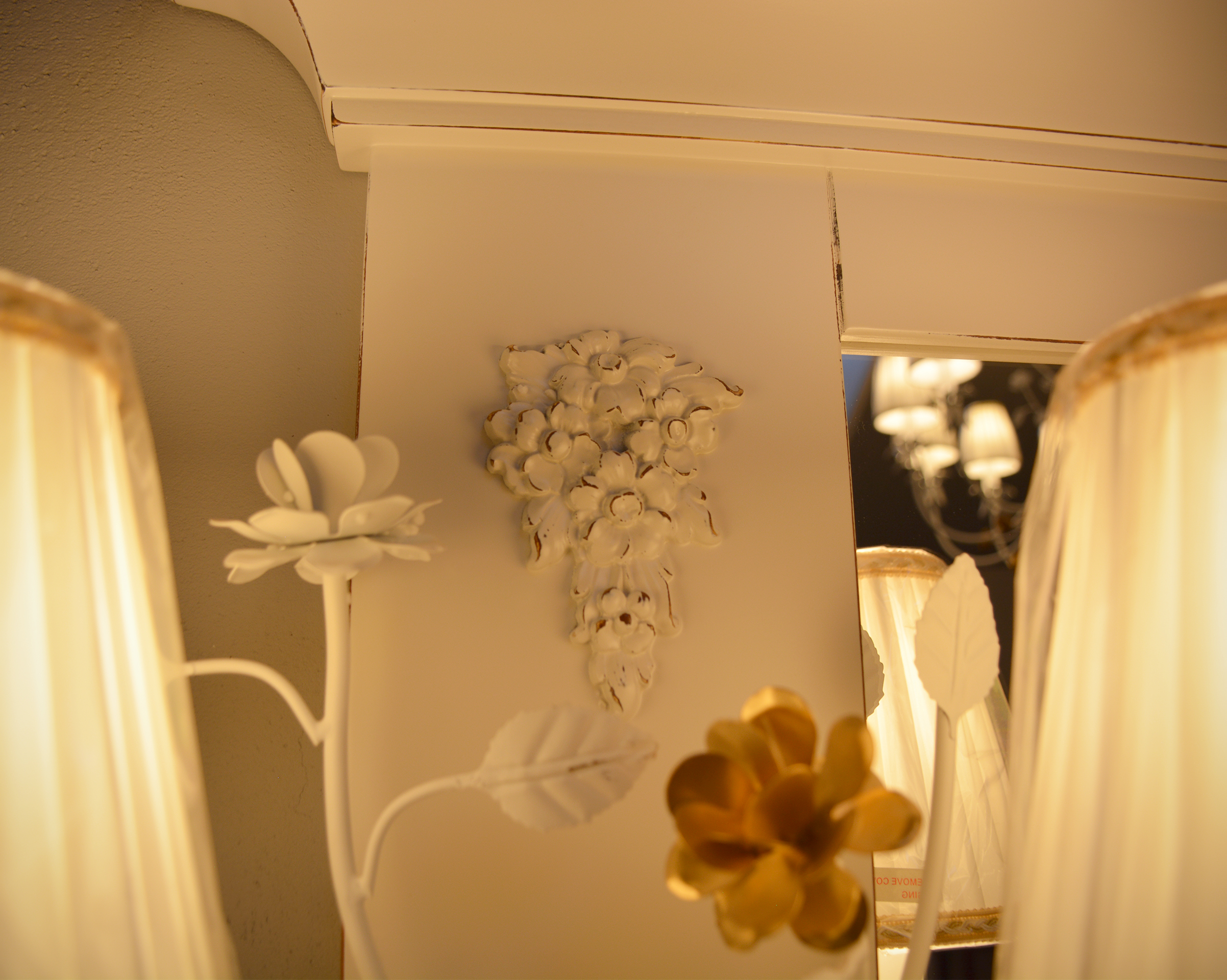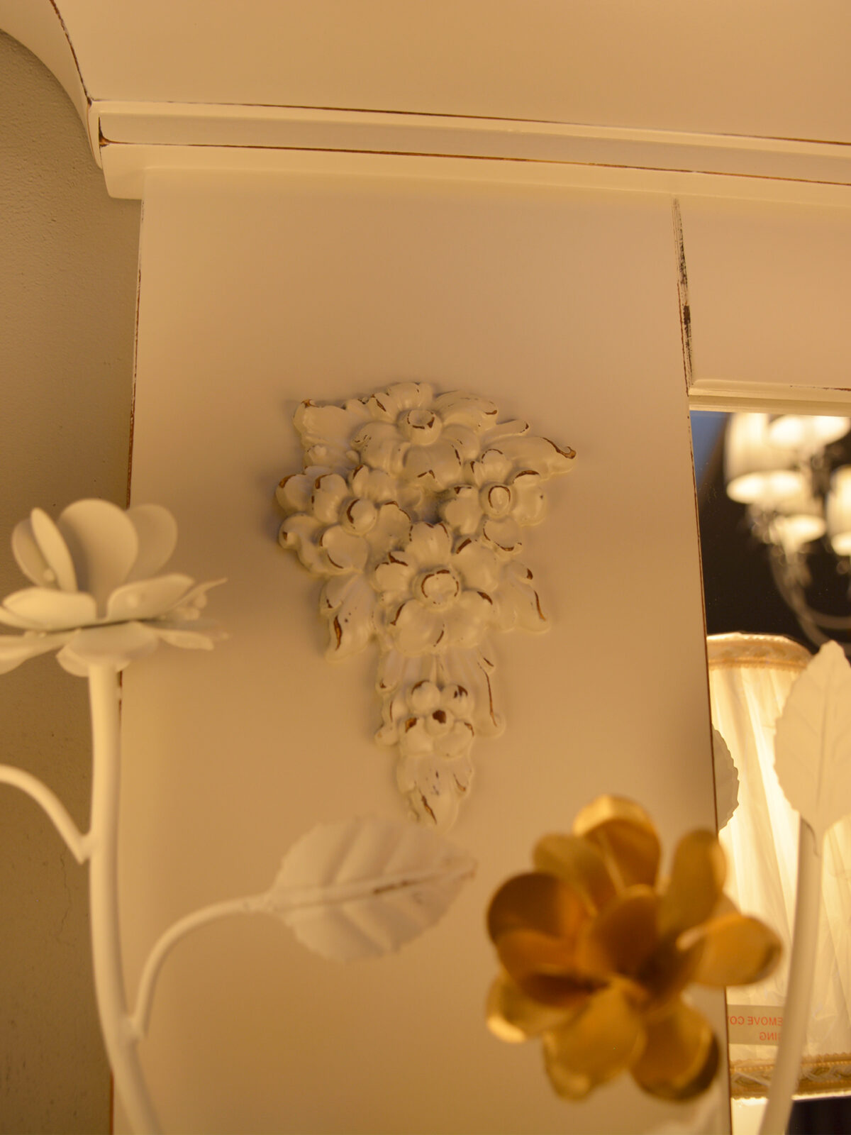 Комод на затейливых ножках, с вкладными ящичками активного цвета в качестве акцента в светлом интерьере, зеркало – как можно больше, ведь стена позволяет и с резными цветочными композициями в поддержку цветам на бра.