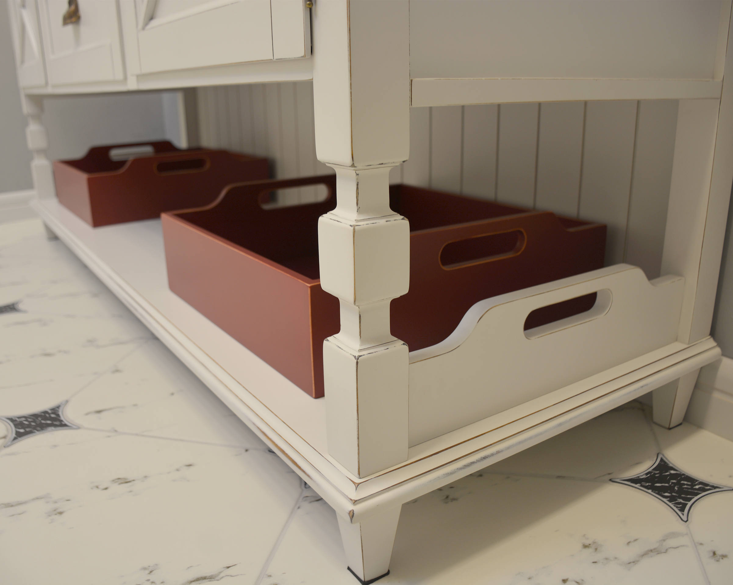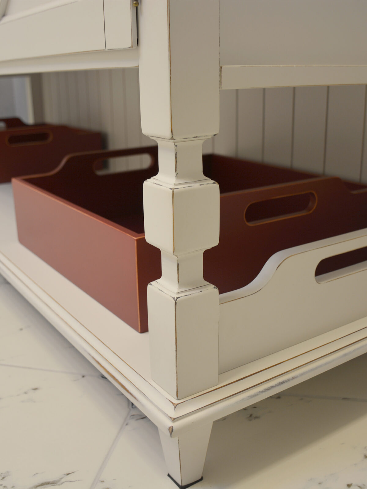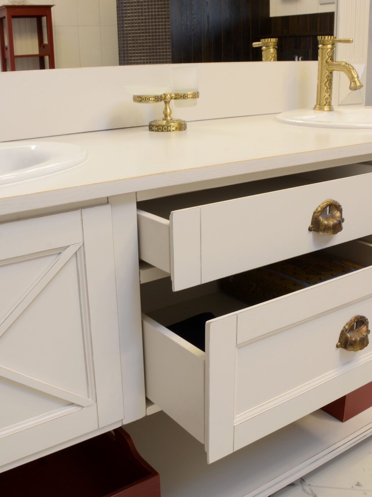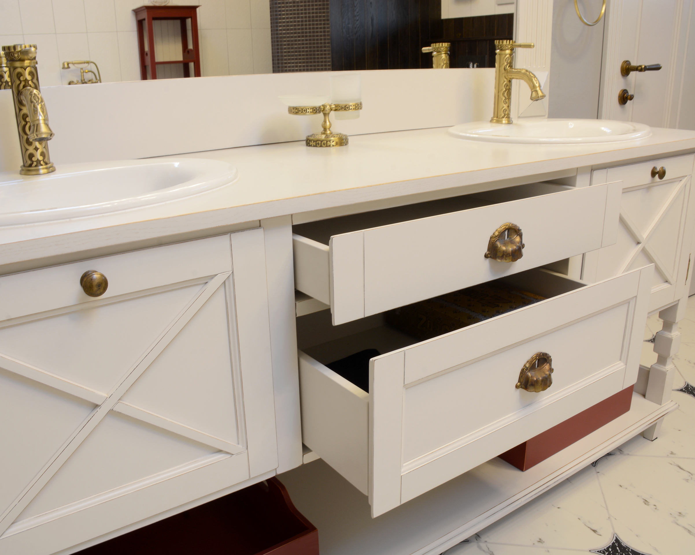 Комод на затейливых ножках, с вкладными ящичками активного цвета в качестве акцента в светлом интерьере, зеркало – как можно больше, ведь стена позволяет и с резными цветочными композициями в поддержку цветам на бра.