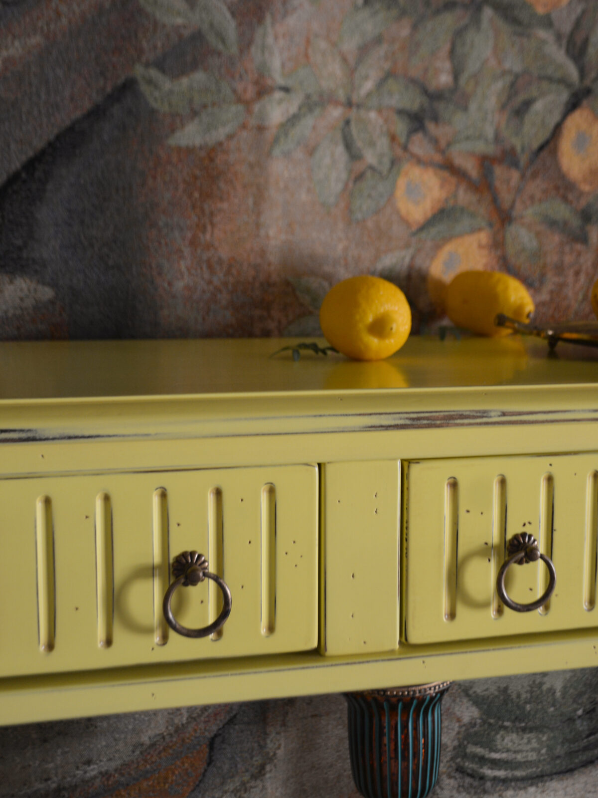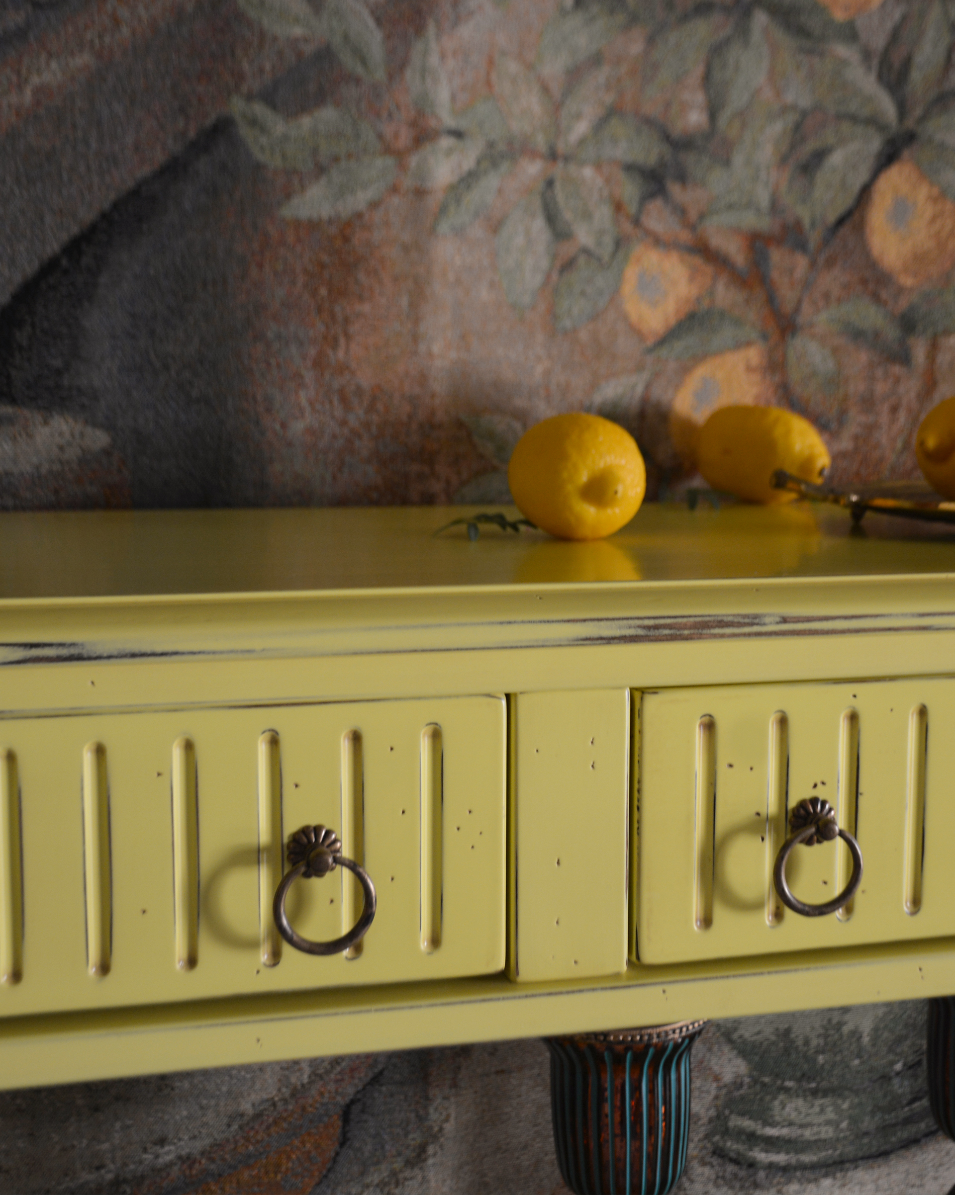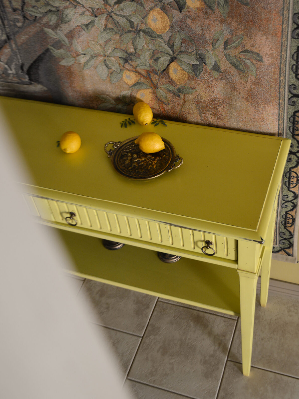 Консоль из массива ольхи в таком позитивном лимонном оттенке под патиной уносит в солнечную Италию на берега озера Гарда, где лимоны – гордость и специализация региона, а местные жители твердо верят, что это еще и родина фрукта.