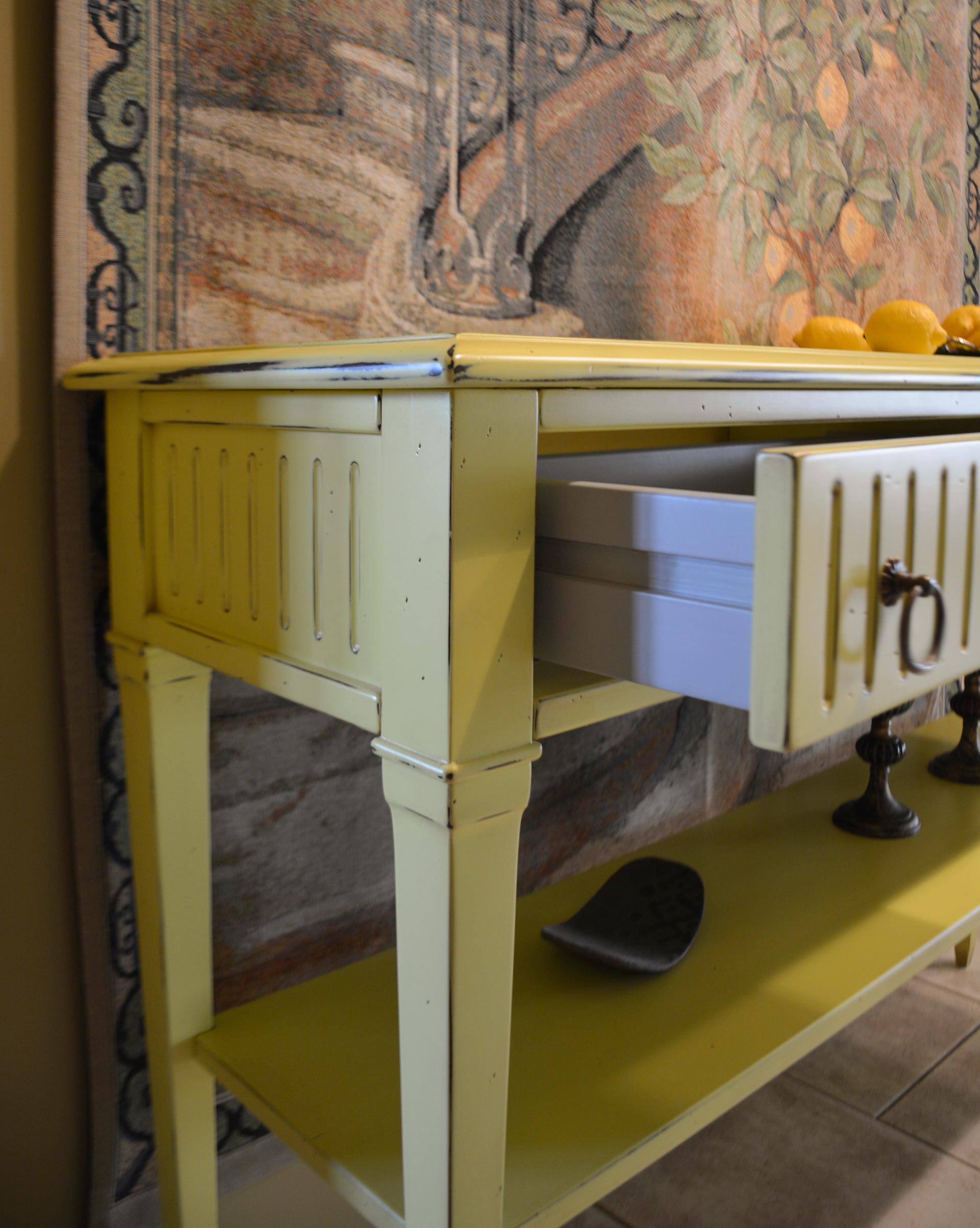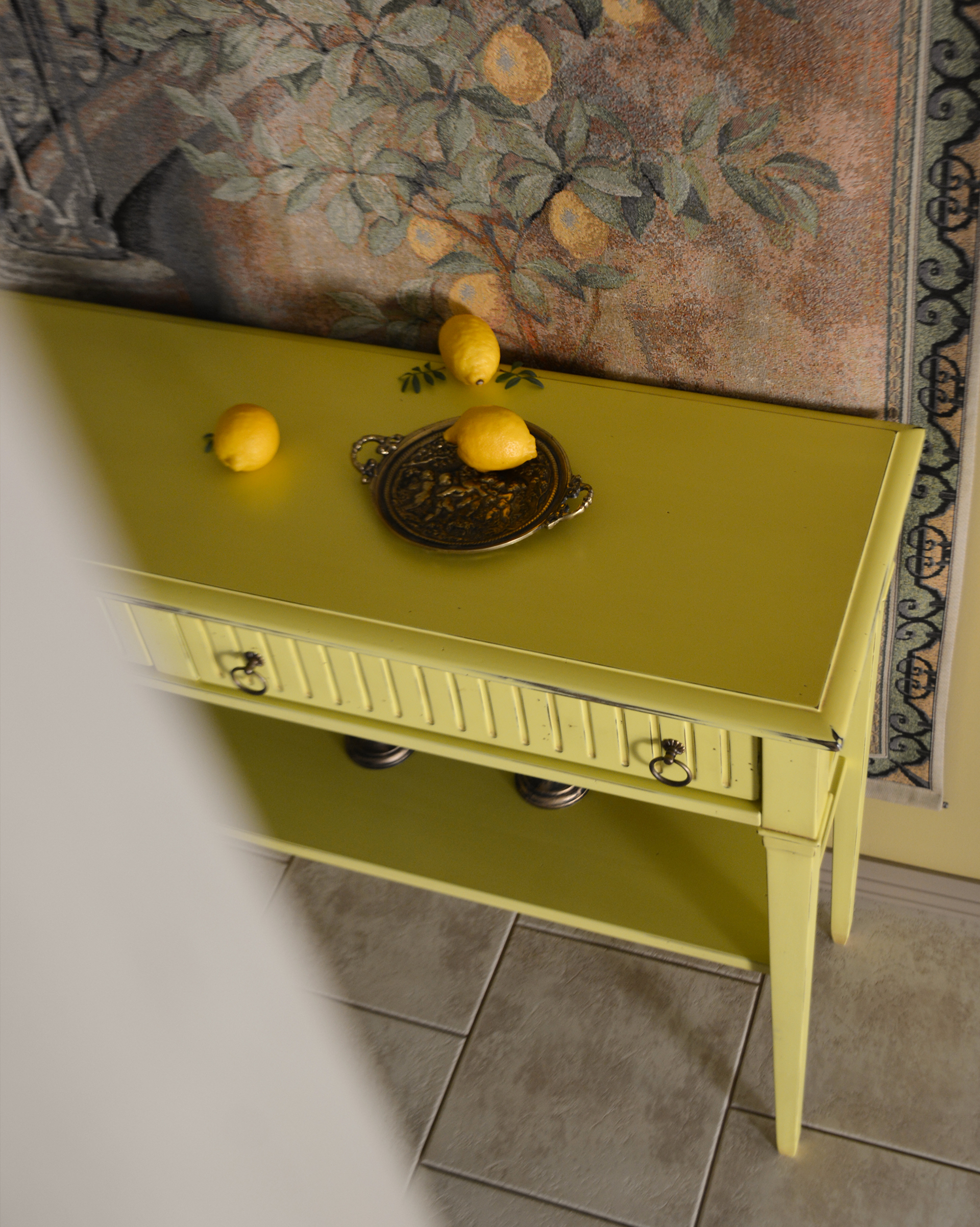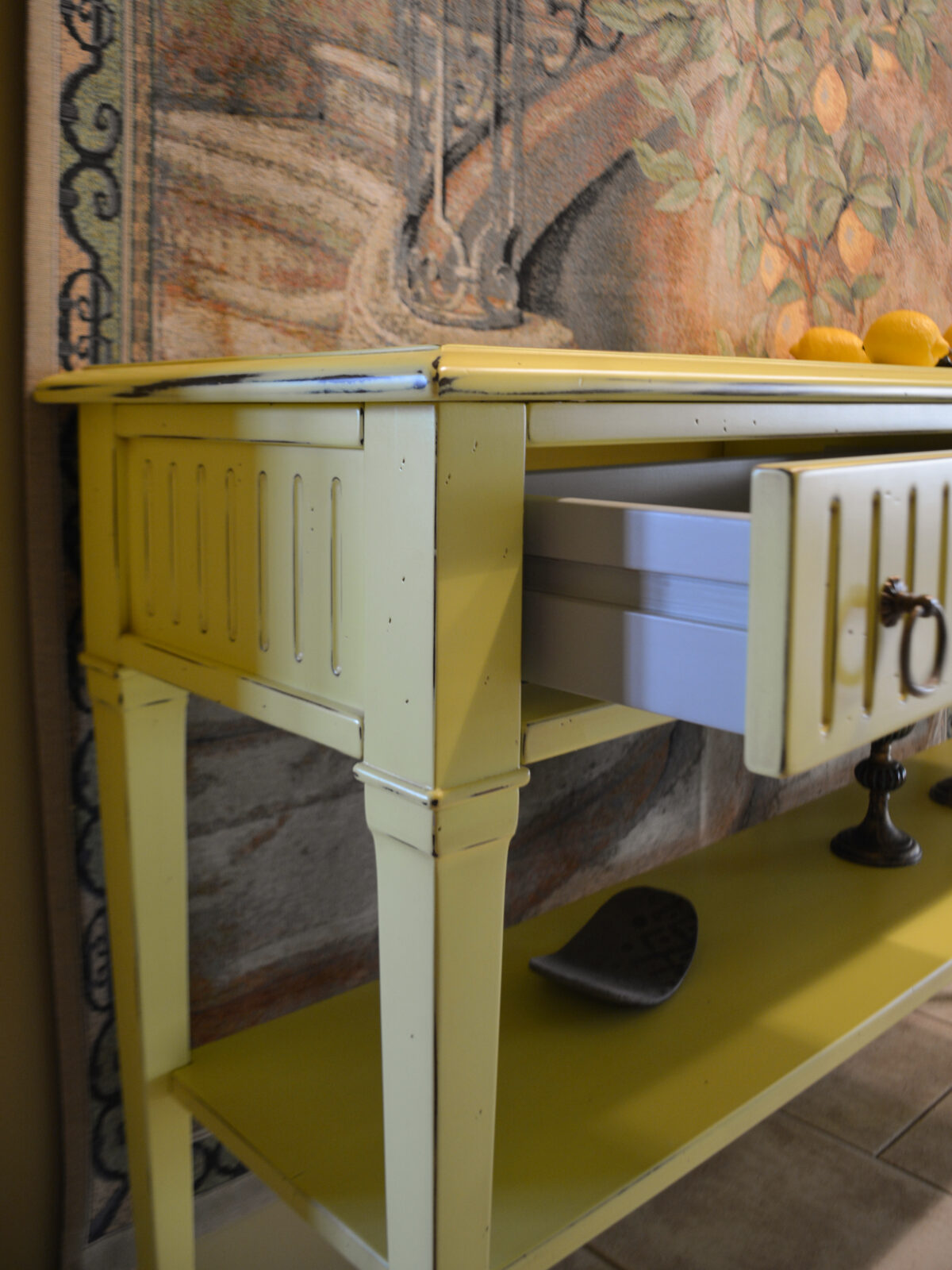 Консоль из массива ольхи в таком позитивном лимонном оттенке под патиной уносит в солнечную Италию на берега озера Гарда, где лимоны – гордость и специализация региона, а местные жители твердо верят, что это еще и родина фрукта.