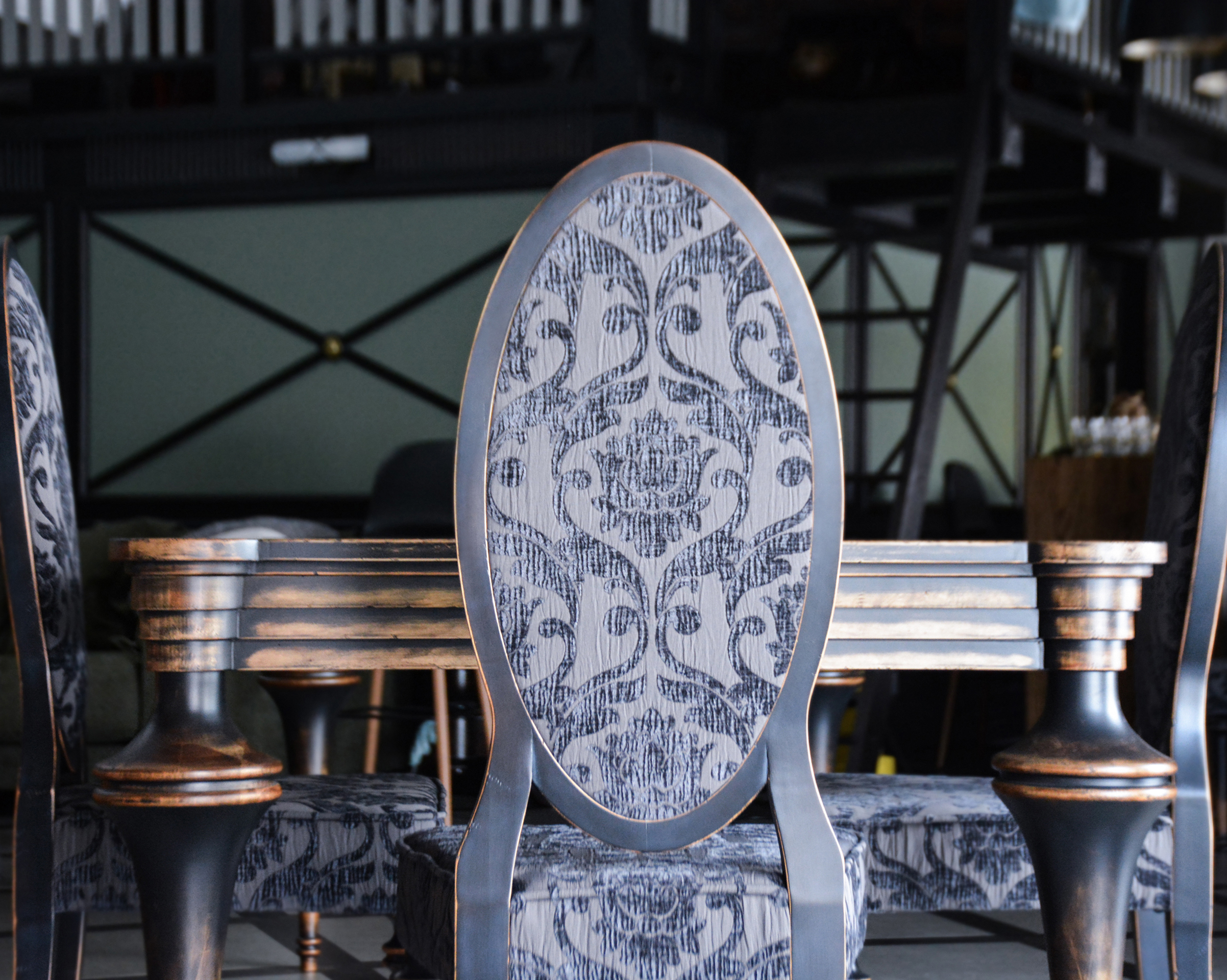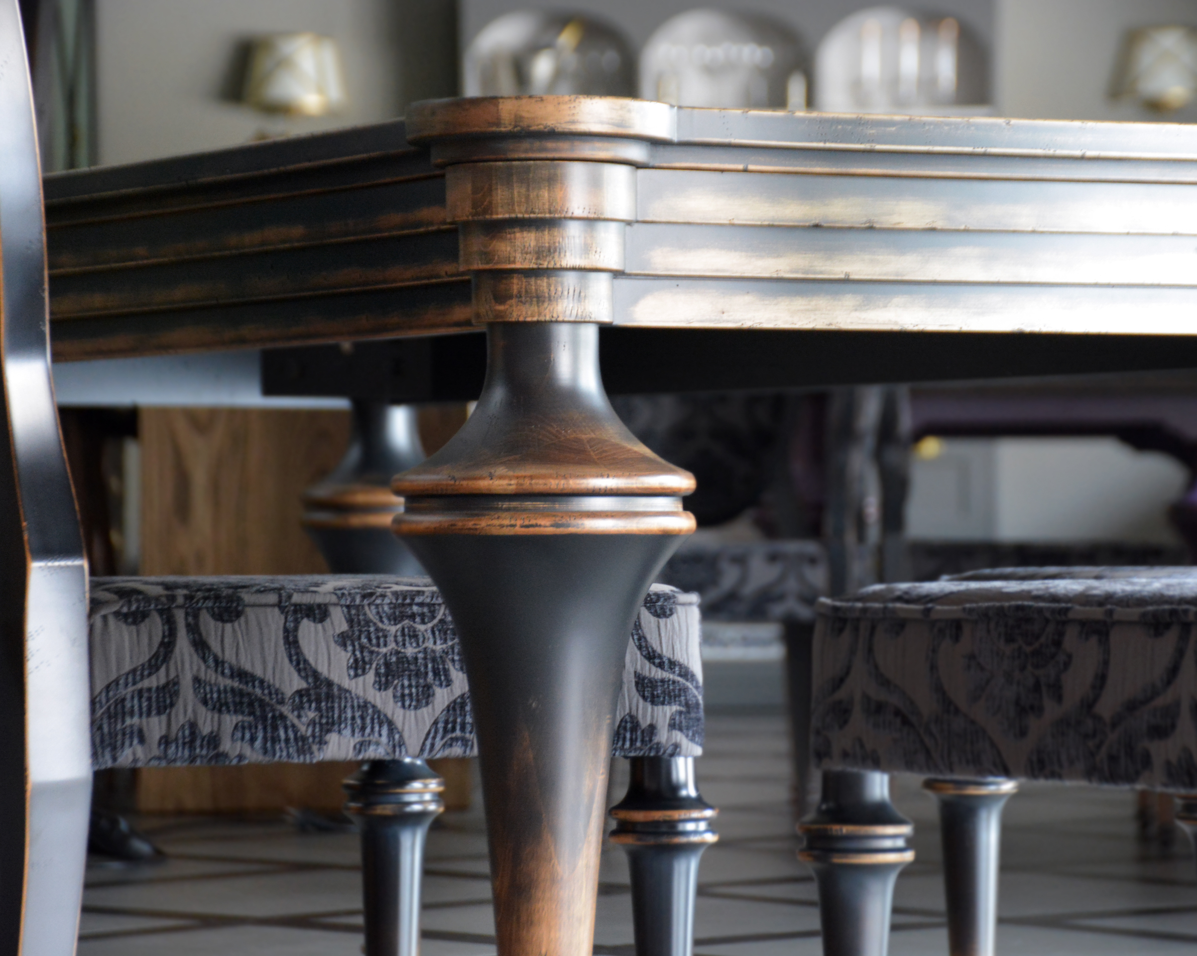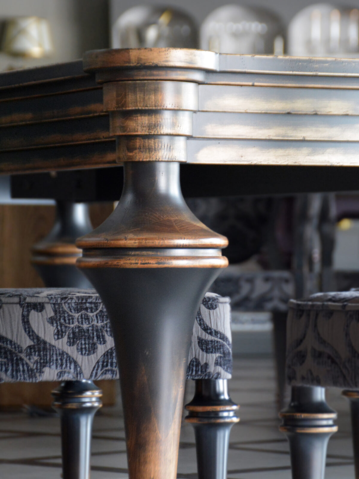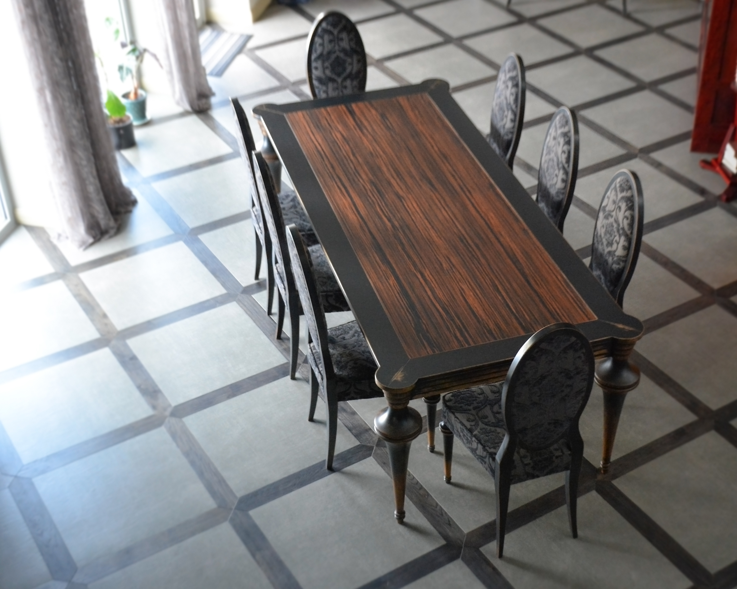 При видимой простоте, стол получился достаточно трудоемким в изготовлении. Точеные, как шахматные фигуры, ножки, сложная ступенчатость опушины и форма столешницы, вставка из яркого экзотического шпона зебрано – стол точно станет предметом №1 в этой гостиной. Потертости подчеркивают все грани и, в то же время, смягчают фасонистость стола и стульев. Активное старение “одомашнивает” это место для семейных посиделок и встреч с друзьями