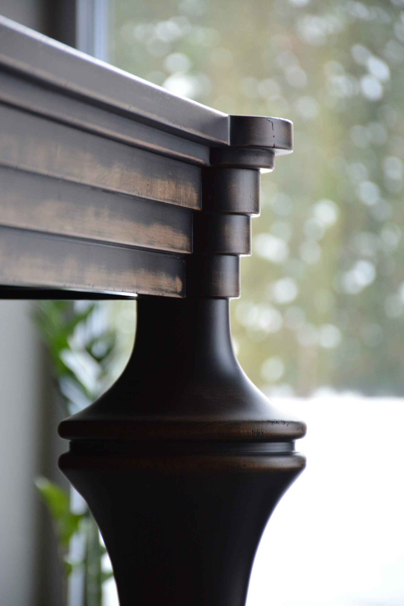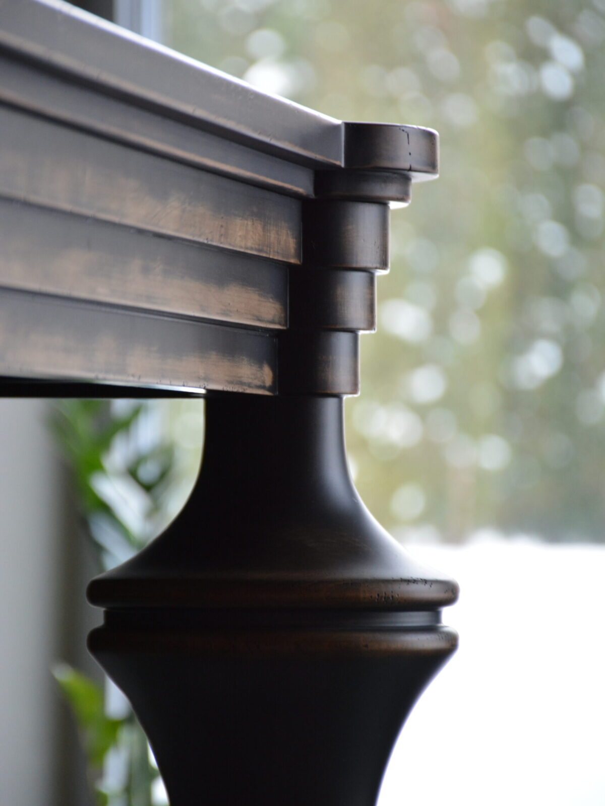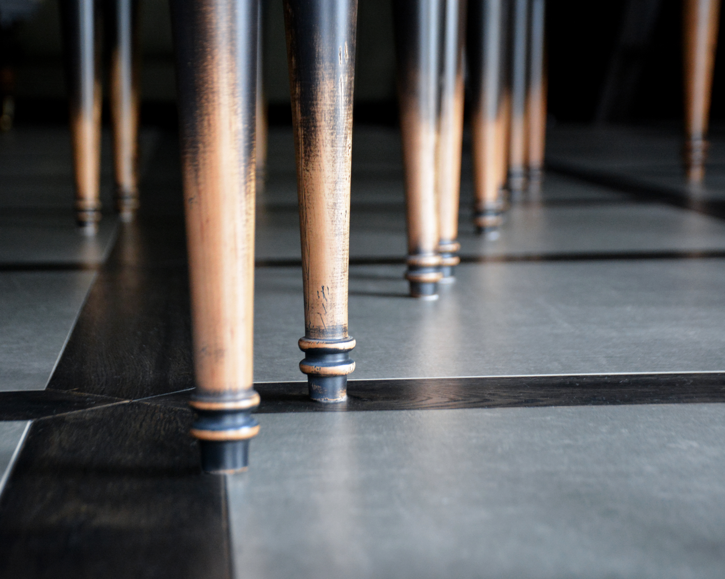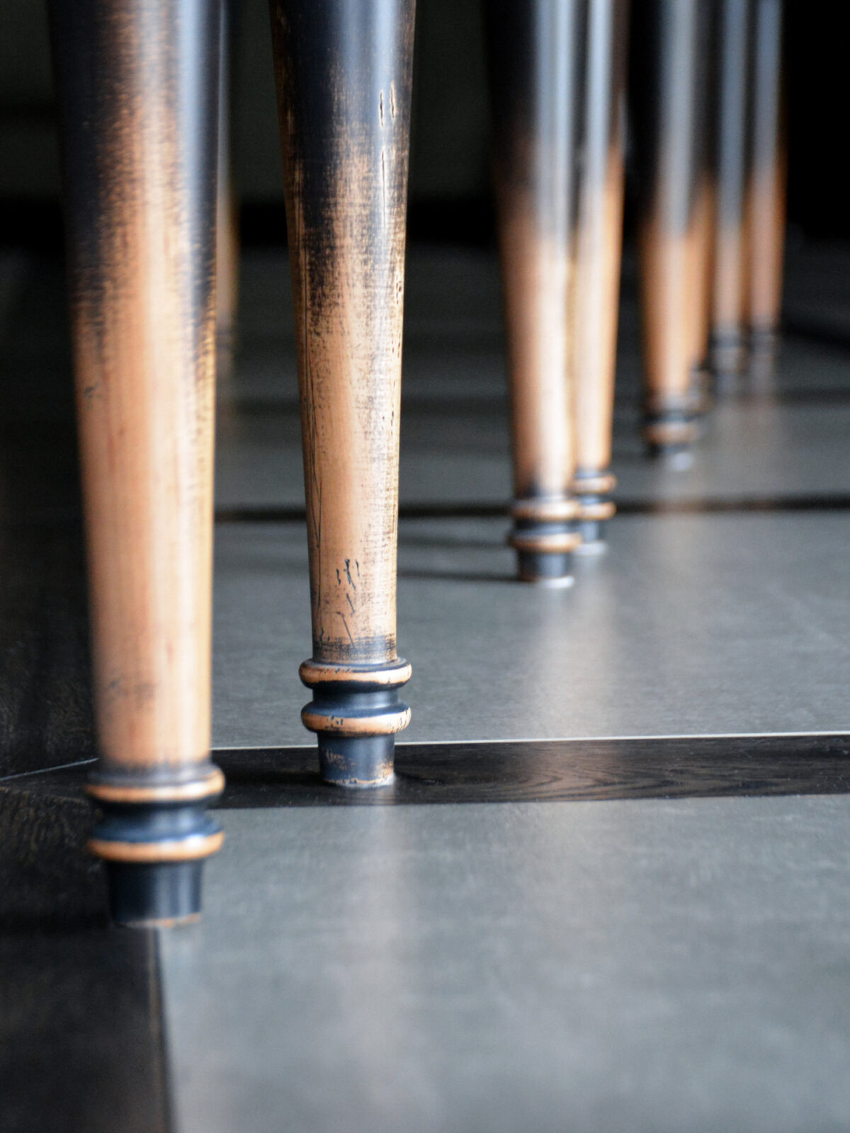 При видимой простоте, стол получился достаточно трудоемким в изготовлении. Точеные, как шахматные фигуры, ножки, сложная ступенчатость опушины и форма столешницы, вставка из яркого экзотического шпона зебрано – стол точно станет предметом №1 в этой гостиной. Потертости подчеркивают все грани и, в то же время, смягчают фасонистость стола и стульев. Активное старение “одомашнивает” это место для семейных посиделок и встреч с друзьями