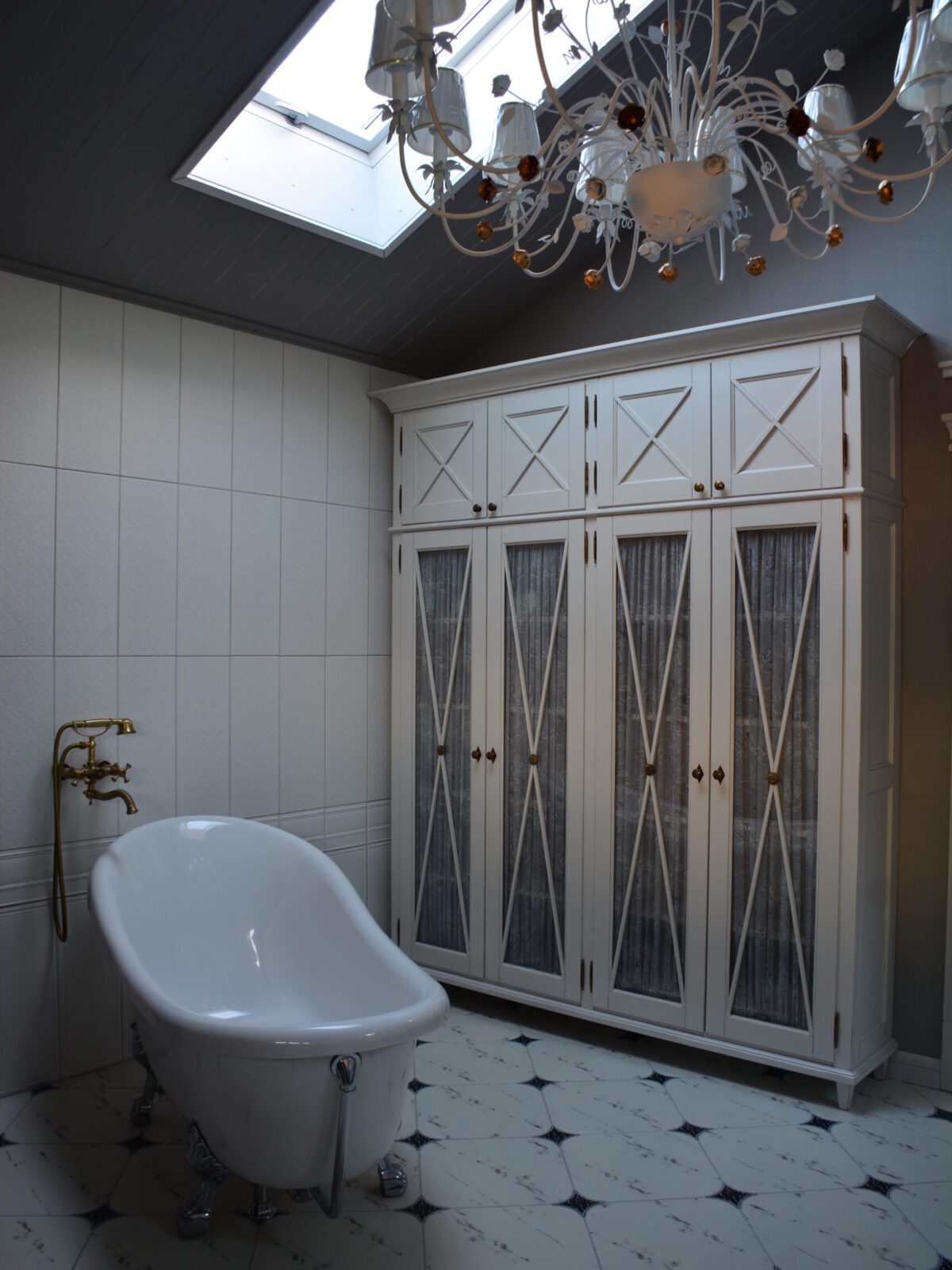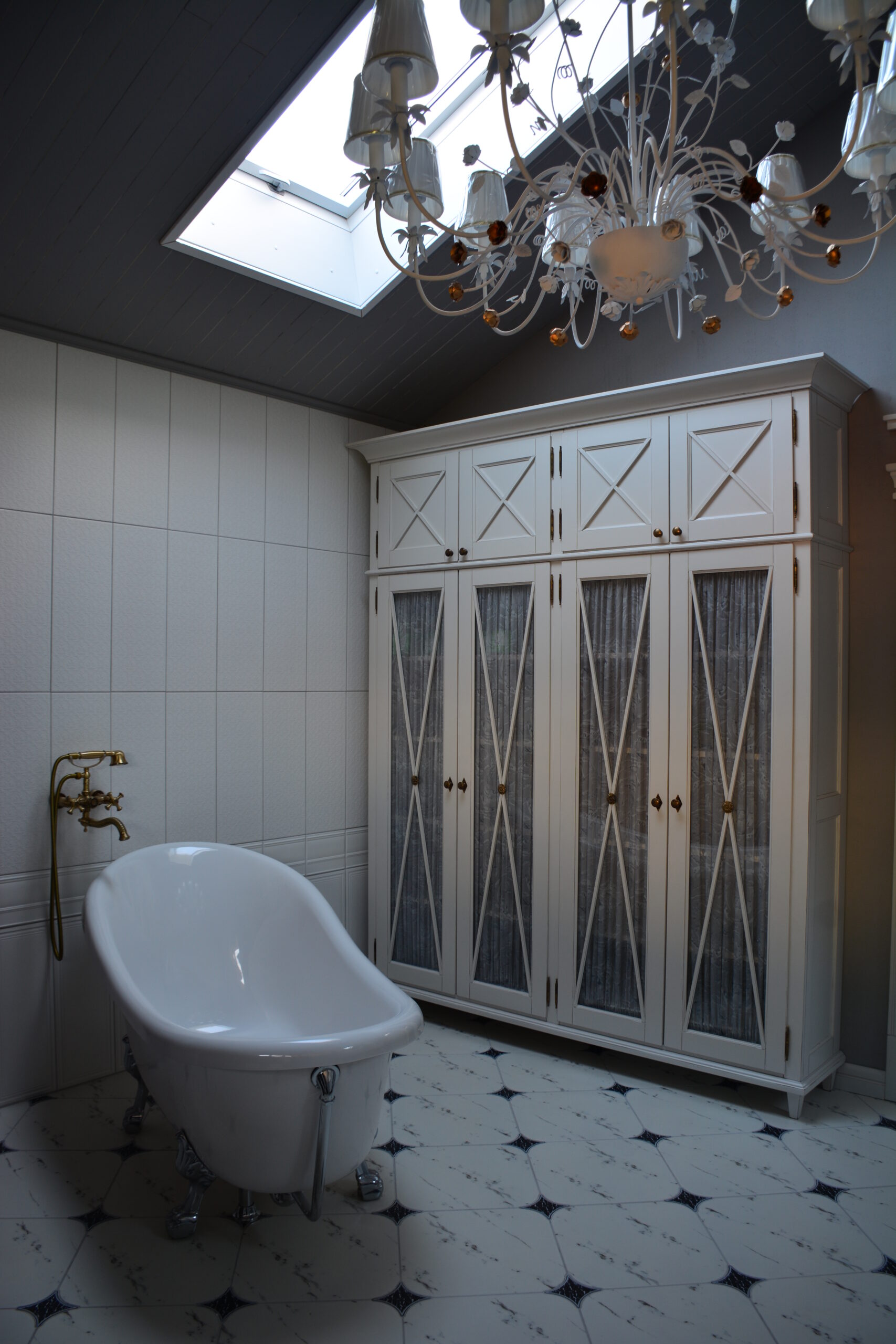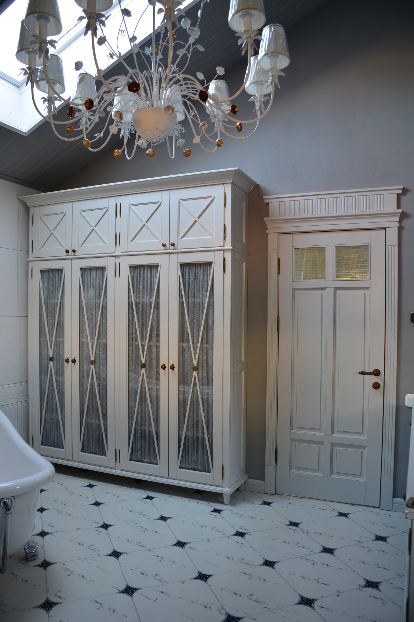 Большой и вместительный шкаф, никаких условностей и решений со встроенными или навесными маленькими шкафчиками для такого большого пространства – в нем поместятся все полотенца, белье и другие необходимые банные вещицы. Дверцы со стеклянными фасадами отражают всё вокруг, делая помещение еще более воздушным и светлым, в то же время шторки прячут содержимое.